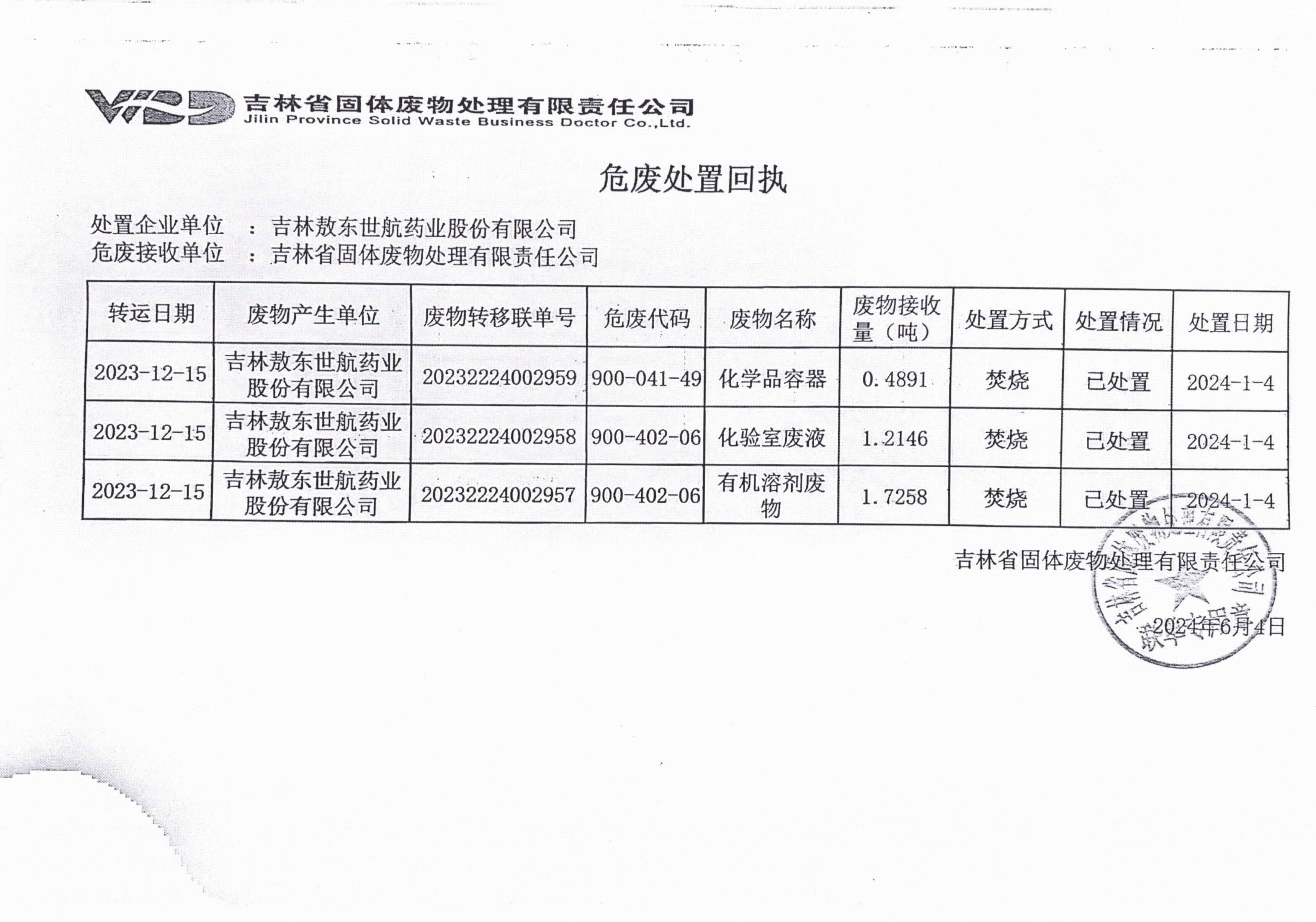 2023年危險(xiǎn)廢物處置回執(zhí)