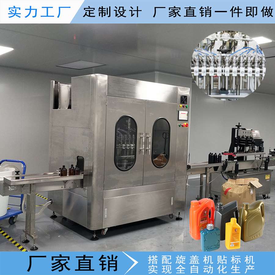 此生產(chǎn)線主要應用于日化廠,化工廠,汽車用品等行業(yè)。例如:洗衣液,洗潔精,洗發(fā)水,沐浴露,潤滑油,剎車油,汽油添加劑等,設備采用先進的光、電、氣一體化自動控制系統(tǒng),實現(xiàn)進瓶,定位,灌裝,出瓶自動化生產(chǎn)。