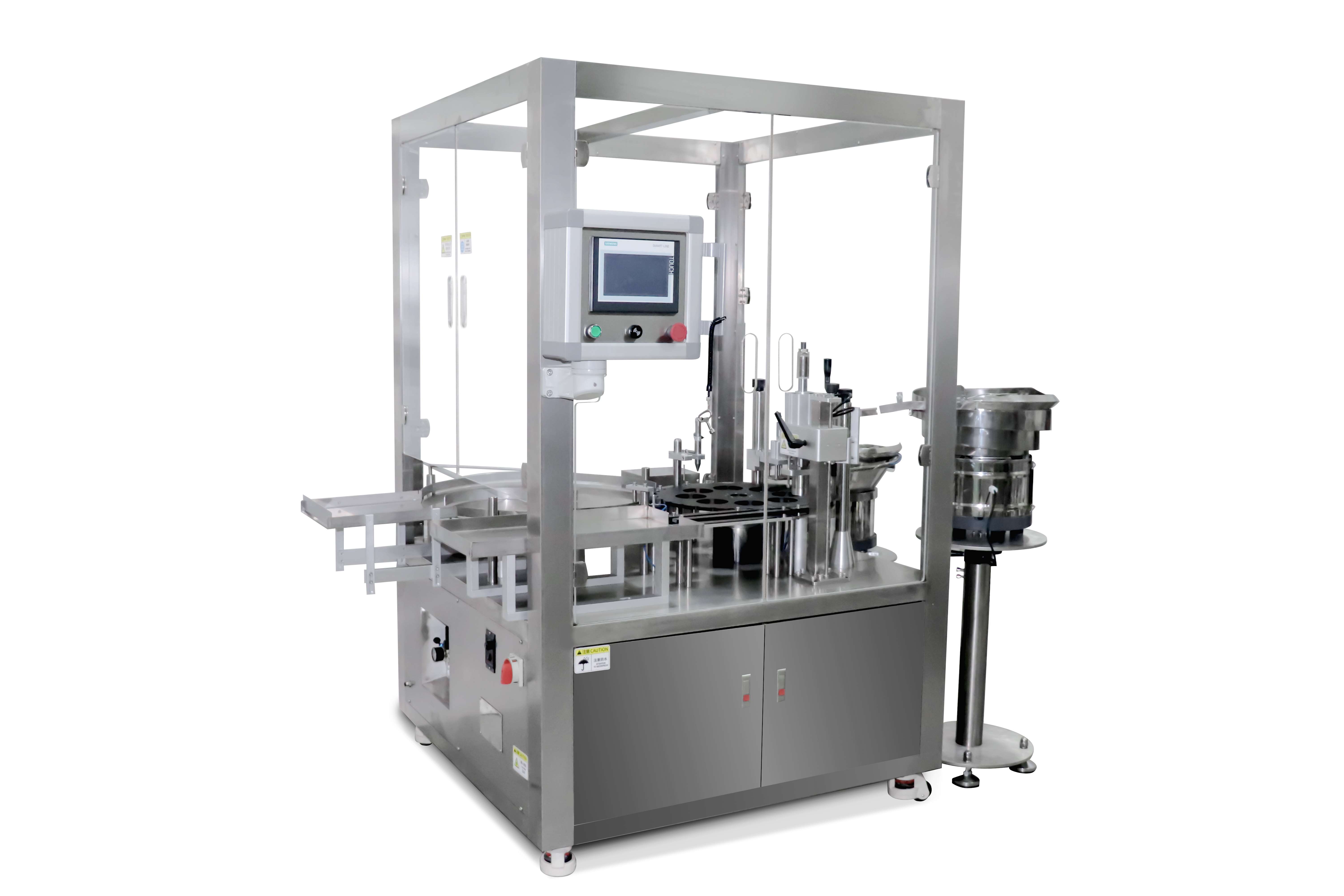 自動灌裝軋蓋機一體機可用于西林瓶、精油瓶、香水瓶全自動灌裝旋蓋及鎖蓋設備。整套流程分為:理瓶-灌裝-壓塞-掛蓋-軋蓋,其特點為生產(chǎn)穩(wěn)定,對包材通用性強。
